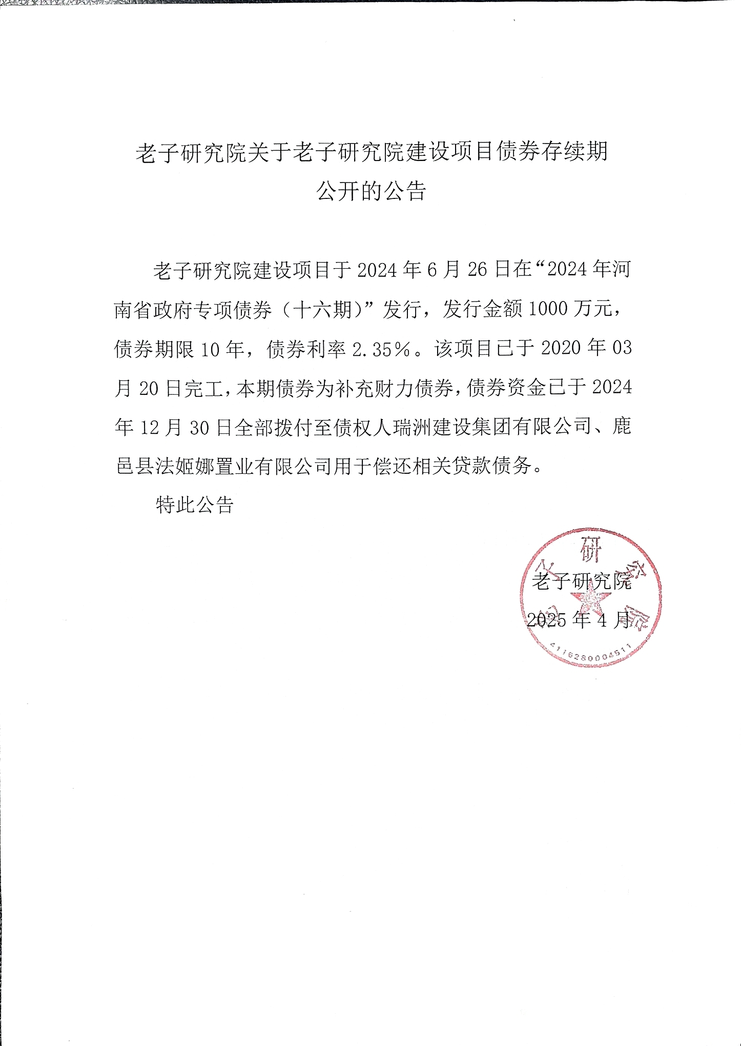 老子研究院建设项目于2024年6月26日在“2024年河南省政府专项债券(十六期)”发行,发行金额1000 万元,债券期限10年,债券利率2.35%。该项目已于2020年03月20日完工,本期债券为补充财力债券,债券资金已于2024年12月30日全部拨付至债权人瑞洲建设集团有限公司、鹿邑县法姬娜置业有限公司用于偿还相关贷款债务。